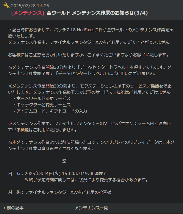 모든 FF14의 전체 점검 공지는 「全ワールド」라는 접두어를 가진다.