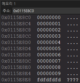메모리 뷰에서 9 다음에 보이는 fdfdfdfd가 보이는가? 저기를 end()가 가리킨다.