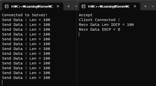 그다음 recv를 걸어 GetQueuedCompletionStatus()를 통해 감지 결과를 받을 수 있게 만든다.