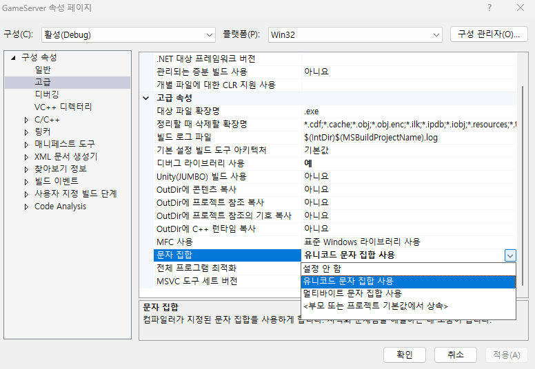 Visual Studio에선 문자집합을 크게 2개로 나누는데, 아래와 같다.