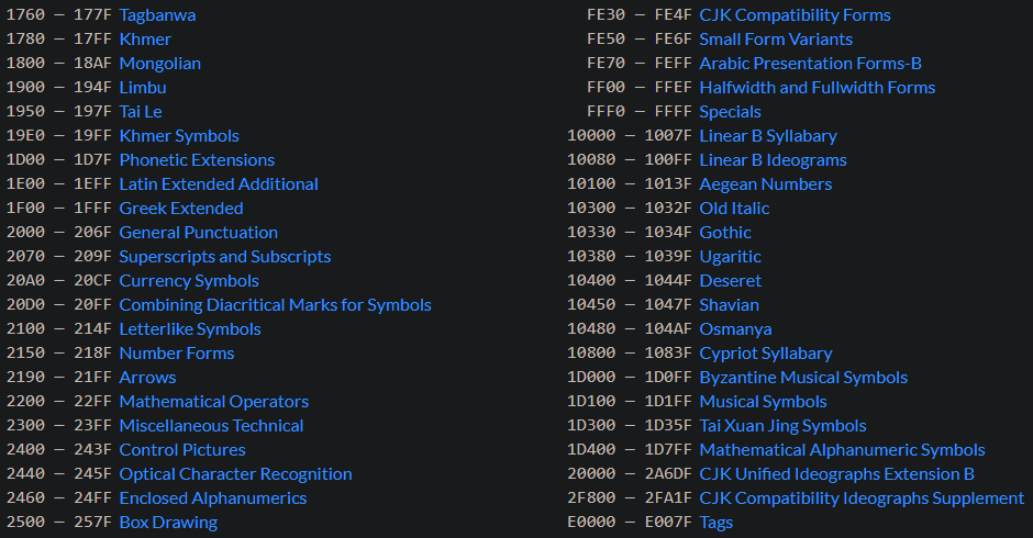 FFFF까지가 0번 평면으로, 10000부턴 1번 평면이다. 1개의 평면 당 65536개의 문자를 가짐을 알 수 있다.